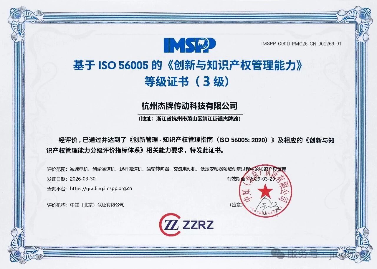 2026年3月30日,杭州杰牌傳動(dòng)科技有限公司順利通過ISO56005創(chuàng)新與知識(shí)產(chǎn)權(quán)管理能力分級(jí)評(píng)價(jià),榮獲3級(jí)認(rèn)證證書,標(biāo)志著企業(yè)在創(chuàng)新與知識(shí)產(chǎn)權(quán)融合管理領(lǐng)域取得重要階段性成果。